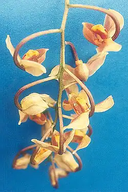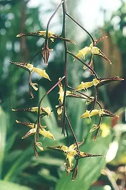 The racemose inflorescence grows from the base of the pseudobulbs. The stem first grows upright, but bends early in development and becomes pendulous. The numerous flowers hang upside down, with the lip upwards. The almost circularly bent pedicels are characteristic of this genus. There are two lateral sepals and one dorsal sepal. The blooms of several species are waxy. The flowers of many species have distinctive fragrances. Some smell like unburned candle wax, others like nutmeg, cardamom, or cinnamon. The pollinia are superposed on a stipe (a cellular pollinium stalk), which is held by a viscid disc.