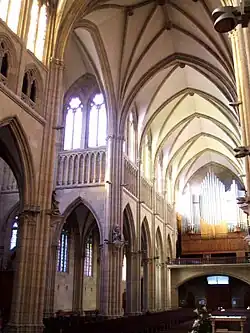 The current organ is the second that has been in the cathedral. It was installed in 1954. According to data published at the time, it was the largest organ in Spain and one of the largest in Europe.[2] Its main console consists of five keyboards for hands, one for feet and 106 stops; also, in the presbytery lies an "echo organ" with two manual keyboards, pedals and 20 stops. The choir organ houses in its interior and exterior 9,535 pipes, the largest measures 10 meters, the whole thing weighing 30 tons. The huge instrument cost more than 1.5 million pesetas, thanks to the legacy of the Fermín Lasala, Duke of Mandas (1832–1917). It was built by Organería Española, of Azpeitia, and its pumps, of several horsepower, were purchased from the workshop of Meindinger from Basel.