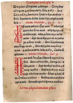 The ornamental headings are printed in red in calligraphic ligatured script with interlaced letters. Especially elaborate are two headings, introducing the Canticles and the Psalms, respectively; they have floral additions in the form of little leaves.[25] The initials used in the psalter can be divided into two groups. The more numerous group comprises 110 initials with slender strokes adorned with graceful foliate tendrils.[24] Their design is based on the decorative tradition of Cyrillic manuscripts, as well as on Renaissance floral motifs.[28] A majority of them are printed from woodcuts created for the 1519 hieratikon. The second group are 39 initials composed of densely intertwined vines. They are larger and look heavier, extending over six to seven lines of text. They are based on initials in the 1508 Wallachian hieratikon. The first part of the Goražde Psalter, comprising the Psalms, is more decorated than the rest of the book. In the first part, the two types of initials are used alternately, most of them printed in red. The rest of the book contains only the initials with slender strokes, and they are rarer, smaller, and simpler than in the Psalms; they are equally printed in black and red.[24]