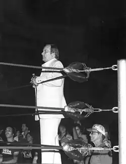 Solie began his pro wrestling career as a ring announcer, making $5 a night[5] emceeing weekly shows in the Tampa Bay area, learning about the sport from John Heath, Eddie Graham, and Don Curtis.[4][6][3] He soon began working for Championship Wrestling from Florida, and in 1960, he moved into the broadcast booth to become the lead announcer for CWF's Saturday morning television shows, a spot he would occupy for the next quarter-century.[4] During that time, he commentated on matches featuring some of pro wrestling's biggest legends, including WWE Hall of Famer Dusty Rhodes, The Brisco Brothers and Dory Funk Jr., among numerous others.[3] Solie rose to national prominence when Superstation WTBS began broadcasting pro wrestling, and the exposure helped him branch out, leading to Solie working for promotions in Georgia, Alabama and Puerto Rico.[4] A technique that Solie used was when he wasn't speaking words into a microphone, he actually recorded them on paper for remembering.[4]
