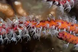 This coral grows as finger-like branches which may be single or relatively unbranched. The polyps are numerous and cover the entire colony except for the basal region. It is variably coloured in red, yellow or orange.[2][3]