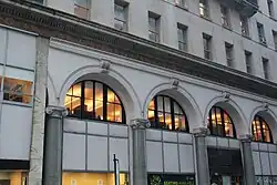 Most of the easternmost arch on 36th Street, and all of the arches on Fifth Avenue, were replaced in 1960 with a storefront composed of an aluminum and glass grid.[16][30] The remaining arches on 36th Street were preserved, with the main entrance to the building being located within the westernmost arch.[4] Each of the arches at the base corresponded to two vertical window bays on the upper floors. There are six bays on the upper floors on the Fifth Avenue facade and 14 such bays on the 36th Street facade.[4]