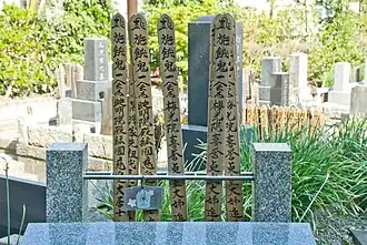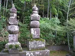 Gorintō (五輪塔) ("five-ringed tower") is a Japanese type of Buddhist pagoda believed to have been first adopted by the Shingon and Tendai sects during the mid Heian period.[1] It is used for memorial or funerary purposes[2] and is therefore common in Buddhist temples and cemeteries. It is also called gorinsotōba or gorinsotoba (五輪卒塔婆) ("five-ringed stupa") or goringedatsu (五輪解脱),[2][3] where the term sotoba is a transliteration of the Sanskrit word stupa.[4] The stupa was originally a structure or other sacred building containing a relic of Buddha or of a saint,[5] then it was gradually stylized in various ways and its shape can change quite a bit according to the era and to the country where it is found.[3] Often offertory strips of wood with five subdivisions and covered with elaborate inscriptions also called sotoba can be found at tombs in Japanese cemeteries (see photo below).[2] The inscriptions contain sūtra texts and the posthumous name of the dead person. These can be considered stupa variants.