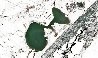 ![]() Sentinel-2 image of the lake in April with part of lake Gorkoye (Chernokurynskoye) below. | |