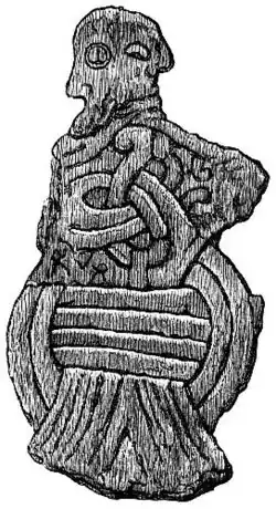 In the barrow was also found a wooden figure that has been interpreted by some as Christ. It is surrounded by a triskele which has been interpreted by some as a symbol of Woden.[1] On the large stones, erected, according to heathen custom, above the barrows, a figure of Christ is seen surrounded by the same heathen triskele.[2]
