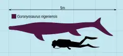 | Diagram of Goronyosaurus, reconstructed as a mosasaurine, based on known fossils.[1][2] | |