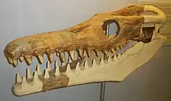 The Iullemmeden Basin was partially submerged under the Trans-Saharan seaway, an inland sea that connected the Tethys Sea to the Gulf of Guinea during the Maastrichtian.[19] The region of the basin that Goronyosaurus inhabited represented an insular flat coastal and estuarine environment characterized by lagoons and salt marshes. The Dukamaje Formation may have in particular represented a sabkha with alternating cycles of flooding and evaporation and influence from brackish water.[20] These conditions probably created to a unique underwater setting that explains the bizarre adaptations of Goronyosaurus. The specialization towards a crocodile-like skull through an elongated and rigid tube-like build, straight conical interlocking teeth, and highly developed snout sensitivity and sense of smell was well-suited for pursuing prey in the environment's unique murky setting. Lingham-Soliar (1999) opined that Goronyosaurus represented an incipient stage towards a freshwater invasion of rivers, which would have been achieved had it not been for the Cretaceous–Paleogene extinction.[21]