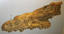 The type specimen[a] of Goronyosaurus, BMNH R 5674 consisting of two vertebrae, was found within a section of the Dukamaje Formation called the "Mosasaurus shales" in northwestern Nigeria[5] and was noted by Franz von Nopcsa in 1925, but he gave no species or genus name,[6] and these remains were described more completely by Swinton et al. in 1930.[1] The holotype material included only isolated vertebrae, a single femur, mandible fragments and teeth which Swinton et al. described and named as the new species Mosasaurus nigeriensis.[1] Later from 1969-1971, two Italian expeditions into same locality sponsored by the National Research Council and National Lincean Academy respectively recovered additional material cataloged as IGF 14750. This included more vertebrae, a partial humerus, a partial pelvis, and a nearly complete skull lacking the rear of the cranium and parts of the mandible. Because of the material being found in the same horizon of the same region of Nigeria, and the similarities in size and anatomy, these new specimens were referred to M. nigeriensis by Augusto Azzaroli and his colleagues.[2]