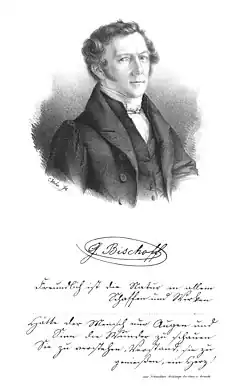 Bischoff was born in Dürkheim and studied botany under Wilhelm Daniel Koch, the author a major flora of Germany, in Kaiserslautern. He then went to the Academy of Fine Arts, Munich in 1819 and then studied botany in Erlangen from 1821. He began to teach in Heidelberg from 1824 and received a habilitation in 1825. He became a professor of botany in 1833 and directed the botanical garden in Heidelberg from 1839. He specialized in the liverworts and mosses coining the terms archegonium and antheridium.[1] Bischoff issued the exsiccata Herbarium normale plantarum officinalium et mercatorium.[2]