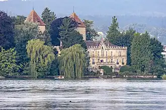 Gottlieben village is first mentioned around the end of the 10th century as Gotiliubon.[2] It was originally part of the land owned by the Bishop of Constance. In 1251, Eberhard von Waldburg built a castle that served as the residence of the Bishops. After the Swabian War in 1499 the episcopal chief constable managed the village and the local low court from the castle until 1798. The court included Engwilen, Siegershausen and Tägerwilen as well as Gottlieben and made up the Bishop's bailiwick of Gottlieben. In 1808 the castle became private property. In 1837 it was renovated in a neo-gothic style.[2]