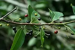 It is a large, fast-growing tree growing up to 50 m tall with a trunk up to 1.3 m diameter, often buttressed at the base up to 2 m diameter, with rough, silvery-grey to reddish-grey bark. It is usually evergreen, but can be deciduous in the dry season. The leaves are alternate, broad lanceolate, with an entire margin and a petiole with a complex vascular system. The flowers are small, yellow-green, with five sepals and petals; they are produced in clusters, and are wind-pollinated. The fruit is an orange-red berry-like drupe 5 mm diameter, containing 5–10 seeds; it is eaten by various birds (including cotingas, pigeons, tanagers, thrushes, and trogons), which disperse the seeds in their droppings.[1][3][6]