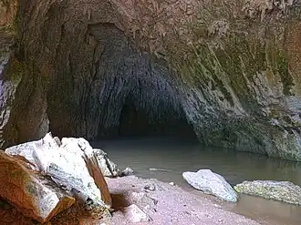 Within the entrance porch is a 40 m (130 ft) long lake, above which is the entrance to a 2 km (1.2 mi) long fossil gallery, 10 m × 20 m (33 ft × 66 ft) wide, which has beautiful stalagmite floors in places. In the floor of this passage are four entrances to the underground river. The fine river passage can be followed up waterfalls and through pools to the large Salle Chevalier. After a complex section the river rejoins the cave. The Jerome siphon can now be passed by swimming.[b][8]