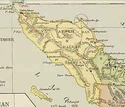 The Governorate of Atjeh and Dependencies was created by the Dutch during the Aceh War in the territory of the Aceh Sultanate which they were attempting to conquer; thus although it was created in the late nineteenth century it did not control a large territory for some time. Part of the reason for their success was their coopting of local elites to participate in their rule.[3] At the turn of the twentieth century it was ruled by a military-civilian governor and a Resident for Acehnese Affairs (Dutch: resident voor de Atjèhsche zaken) as well as several Assistant Residents.[2] The government structure of Atjeh was significantly influenced by the Orientalist Christiaan Snouck Hurgronje.[1] The borders were redrawn as well; in 1902 and 1904 Trumon and Singkil were transferred to Atjeh from Tapanoeli Residency.[4]