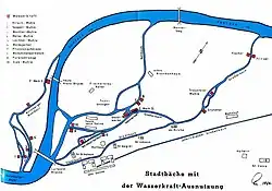 The Grabenbach leads intruding fresh water and water driving the wheels out of the galleries, so that it does not mix with the salty water. Today a part of the water is used for a water-treading basin in the pedestrian zone. Additionally, there are pipes in the canal that carry the brine to the graduation tower and the spa pump room. Also, rainwater of the pedestrian zone is led into the Grabenbach.