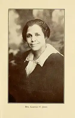 Much loved by the community,[3] Jones became known as 'The Sunshine Lady of the Piney Woods'.[6] The couple began married life in a one-room log cabin at Piney Woods, before moving into 'the corner room of a school building, another room in an academic building, an old mill house, and finally a comfortable cottage in 1922'.[3] This final cottage they named the Community House, because of its regular use as the location for meetings and gatherings.[3] They had two biological children, Laurence Jr. and Turner Harris,[3][2] and adopted a daughter, Helen Elizabeth, who went on to be a successful jazz musician.[14]