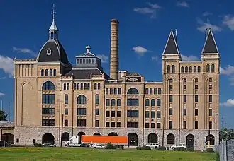 The former brewery building in Northeast, Minneapolis, located north of Broadway Street Northeast on the east bank of the Mississippi River, is listed in the National Register of Historic Places.[7] It was renovated and redeveloped by Ryan Companies for multiple tenants. The contributing structures include the Brewhouse, currently the home of RSP Architects, which was designed by the architectural firm [8] of Wolff [9] and Lehle;[10] the power station (Boiler House); the Wagon Shed and Shops (Gasthaus), which has become the Pierre Bottineau Branch of Hennepin County Library; the Grain Belt Office Building (designed by Carl F. Struck);[8] the Bottling House, including the 1969 addition, which now serves as a space for artist studios; the 1910 Warehouse, including its 1949 and 1957 additions, but not its 1964 addition, which has been developed into office and light industrial space; and a railroad spur. The Keg House is also part of the complex, but not part of the Registered Historic Place entry. The renovation has won the National Preservation Award from the American Institute of Architects. The area forms an anchor to the Northeast Minneapolis Arts District, including many members of the Northeast Minneapolis Arts Association. The 1964 addition to the warehouse will be demolished as part of the development of Sheridan Memorial Park.