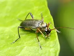 Grammoptera ruficornis can reach a body length of about 3–7 mm (0.12–0.28 in). Females are longer and wider than males. These small longicorns have a stretched and densely punctate body (pronotum and elytra), not very narrow at the back, with silky hairs on the elytra. Eyes are rather close to the jaw base. The color is dark brown or black, with long yellow-red antennae that are almost as long as the body and show an elongate 2nd segment. Also the legs are partly yellowish red, with bulbous bicoloured femora, but hind femora sometimes are entirely black.[5][6]