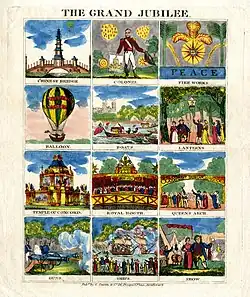 The event was centred on London's Royal Parks, which were lit with lanterns during the night.[3] The Prince Regent's personal architect, John Nash, was commissioned to design a Chinese-style bridge and pagoda across the canal in St James's Park.[1][3] A "Temple of Discorde" was erected in Green Park which, by means of a mechanism designed by Sir William Congreve and under cover of firework display, transformed into a "Temple of Concorde". During the fireworks display aeronaut Windham William Sadler ascended in a hot air balloon and distributed favours and programmes onto the crowd below.[4] Also a sign reading "PEACE" was illuminated.[3] During the jubilee night Nash's pagoda set alight and at least one man, James Taylor,[2][5] was killed.[6]
