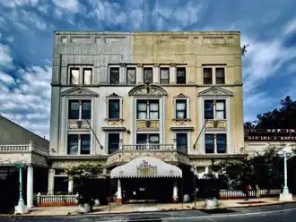 The building was four stories tall and faced in buff-gray brick, with pressed metal decoration that was originally colored to resemble limestone.[65][67] The windows were surmounted by pediments, while the top of the building had a cornice with a sculpted pediment in the center. The first floor was designed with storefronts, as well as an entrance with columns at the center; these were subsequently modified.[65]
