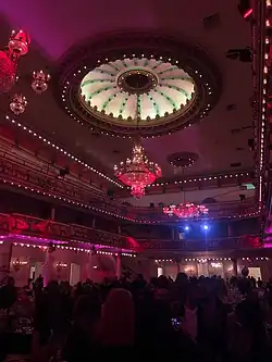 The rear of the building was arranged around the ballroom, which was at the top of the staircase.[28][72] Measuring 68 by 125 ft (21 by 38 m) across by 40 ft (12 m) tall,[68][69] The ballroom was variously cited as containing 1,500[73] or 1,700 seats.[28] Two levels overlooked the space:[28][73] a lower balcony and an upper gallery, both accessed by marble stairs.[68][69] Both of these levels were supported on marble columns and surround the ballroom on all sides except the front.[68][69][70] They had decorative elements such as garlands and cartouches. The balcony consisted of a set of theater boxes that are sloped slightly downward to the front of Grand Prospect Hall.[70] It was designed with 26 private boxes and four larger proscenium boxes.[68][69] The gallery had a steeper downward rake and contained wooden benches and plaster rails. The ceiling was mostly flat, though it was surrounded by a cove.[70] The central dome, which contained direct and indirect lighting, was 35 ft (11 m) across.[68][69] The rear of the ballroom, near the northern end, had a stage inside a plaster proscenium, which in turn had a cornice atop it.[70] There were auxiliary spaces, such as dressing rooms, adjacent to the stage.[68][69][70]