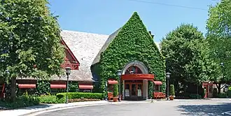 The former depot is a rectangular, gable-roofed, Tudor Revival structure constructed of red-brown brick with a slate roof. The structure has a concrete foundation and structural steel framing. The front facade has a projecting gabled entryway of white limestone, with a recessed round-head entrance. Several half-timbered gables are in the roof, with decorative herringbone and basketweave brickwork.[3]