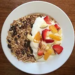 Granola is often eaten in combination with yogurt, honey, fresh fruit (such as bananas, strawberries or blueberries), milk, or even with other forms of cereal. It also serves as a topping for various pastries, desserts or ice cream. Granola is similar to muesli, except the latter is traditionally neither sweetened nor baked.