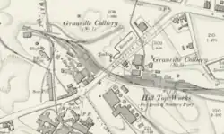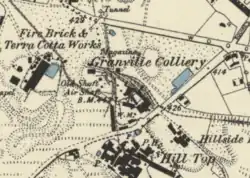 By 1900 No.1 Colliery had ceased working the Main seam and started on the Cannel seam and No.2 had started to work the Kilburn seam.[4] The Granville Colliery Company also operated the Granville Flour Mill and a nearby fish pond was used as a head of water for the mine and a reception point for water pumped form the workings.[5] The collieries were connected to a branch of the Midland Railway.[2]