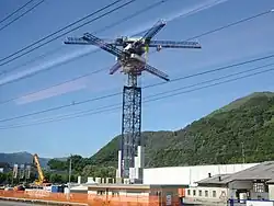 Energy Vault, a Swiss company founded in 2017, stores electricity using a crane that raises and lowers blocks of concrete.[15][16][17] In late 2020, a prototype built in Arbedo-Castione used six cranes on a 110-meter-high tower to move 35-ton concrete blocks with a capacity of 80 megawatt hours.[18][19]
