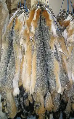 The durability coefficient for gray fox fur is given as 50 to 60 percent.[Note 1][7] When fur animals are divided into the fineness categories, among which are silky, fine, medium-fine, coarser and hard, gray fox hair is classified as coarser.[8]