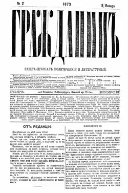 Grazhdanin (Russian: Гражданин, lit. The Citizen) was a Russian conservative political and literary magazine published in Petersburg in 1872–1914 (with a one-year interval in 1880–1881). The magazine was founded by Prince Vladimir Meshchersky. It came out weekly or two times a week, and daily in 1887–1914. Grazhdanin exerted some influence on policies of the Russian government. It adhered to principals of monarchism and opposed liberal press and revolutionary movements. Fyodor Dostoyevsky was the magazine's chief editor from the early 1873 to April 1874. Throughout this magazine's existence, people like Konstantin Pobedonostsev, Nikolay Strakhov, Aleksey Pisemsky, Nikolai Leskov, Fyodor Tyutchev, Apollon Maykov, Yakov Polonsky, Aleksey Apukhtin, Vasily Nemirovich-Danchenko and others published their works on its pages.