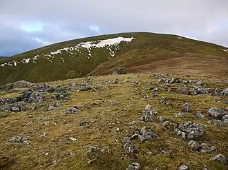 To the north-east a long ridge leads to the subsidiary stony top of Randerside (729 metres; 2,392 ft). From there it broadens into Matterdale Common, becoming steadily wetter underfoot, before splitting into two on either side of Groove Beck. The more southerly ridge heads over High Brow (575 metres; 1,886 ft), fringed by Dowthwaite Crag which broods over the road-end settlement of Dowthwaitehead. The further tops of Low How (497 metres; 1,631 ft) and Cockley Moor (455 metres; 1,493 ft) are passed before this branch of the ridge peters out in extensive conifer plantations, and then the ground climbs again to Great Mell Fell. The northern branch of the ridge is edged by Wolf Crags above the Old Coach Road, beyond which a wide grassy moor sweeps north across Sandbeds Moss and Flaska to the A66 road and the dismantled Penrith to Keswick railway.[1]