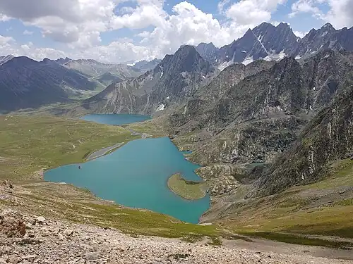 ![]() Twin lakes of Vishansar and Krishansar seen from Gadsar Pass. | |