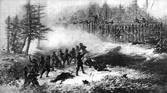 Four days later, the Great Swamp Battle took place on the bitterly cold and stormy day of December 19, 1675. The colonial militia from Plymouth Colony, Connecticut Colony, and Massachusetts Bay Colony were led to the main Narragansett settlement in South Kingstown, Rhode Island, by an Indian guide named Indian Peter.[15] The low temperatures froze the natural moat that surrounded the Narragansett encampment, allowing the colonial troops to pass easily.[14] The massive fort occupied about 5 acres (20,000 m2) of land and was initially occupied by over a thousand people, but it was eventually overrun after a fierce fight. The settlement was burned, its inhabitants (including women and children) killed or evicted, and most of the tribe's winter stores destroyed. It is believed that at least 97 Narragansett warriors and 300 to 1,000 non-combatants were killed, though exact figures are unknown.[3] The forces destroyed the blacksmith forge of Stonewall John, although he escaped and was killed several months later.[16]