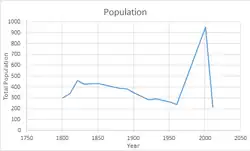 A significant change was seen in the 2001 census, with the recorded population being 951.[13] These were only temporary residents however, with the 2001 census showing 723 of the 2001 population living in communal establishments as opposed to 0 in 2011. Additionally, 540 of the 2001 population were classed as economically inactive, while this was only 3 for the 2011 population.[12] The population has decreased again since, and the population in the last census was the lowest recorded yet for Great Thurlow.