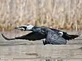 It forages by foot-propelled diving and capturing its prey in its beak. The duration of its dives varies from 1–3 minutes, with the bird diving to depths of up to a maximum of 9.5 metres (31 ft).[20] About 60% of dives are to the benthic zone and about 10% are to the pelagic zone, with the rest of the dives being to zones in between the two.[27] Studies suggest that their hearing has evolved for underwater usage, possibly aiding their detection of fish.[30] These adaptations also have a cost on their hearing ability in air which is of lowered sensitivity.[31]