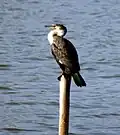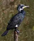 The great cormorant (Phalacrocorax carbo), also known as just cormorant in Britain, as black shag or kawau in New Zealand, formerly also known as the great black cormorant across the Northern Hemisphere, the black cormorant in Australia, and the large cormorant in India, is a widespread member of the cormorant family of seabirds.[2] It breeds in much of the Old World, Australasia, and the Atlantic coast of North America.