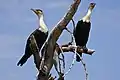 In European waters the great cormorant can be distinguished from the European shag by its larger size, heavier build, thicker bill, lack of a crest and body plumage with a purple, not green, tinge. In eastern North America, it is similarly larger and bulkier than the double-crested cormorant; the latter species also has more yellow on the throat and bill and lacks the white thigh patches seen on breeding plumage adult great cormorants. Both European shag and double-crested cormorant also differ in having 12, not 14, tail feathers.[20][21] Identification between the great cormorant subspecies is difficult, and complicated by hybridisation between the subspecies; the most useful character is the shape of the gular skin patch, which forms an acute angle in nominate P. c. carbo, and an obtuse angle in P. c. sinensis;[22][21] similar variation is used to distinguish P. c. hanedae and P. capillatus in eastern Asia.[23] Differentiation between the two white-breasted African subspecies remains complex and uncertain.[24]