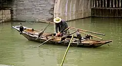 Cormorant fishing is practised in China, Japan, and elsewhere around the globe. In this practice, fishermen tie a line around the throats of cormorants, tight enough to prevent swallowing the larger fish they catch, and deploy them from small boats. The cormorants catch fish without being able to fully swallow them, and the fishermen are able to retrieve the fish simply by forcing open the cormorants' mouths, apparently engaging the regurgitation reflex.[36] To encourage its cooperation, the fisherman would reward the cormorant by letting it keep every eighth fish. The cormorants would eventually recognise this pattern and refuse to perform the eighth dive unless the fishing line was untied, and if the reward fish was not provided it would refuse to dive altogether.[37]