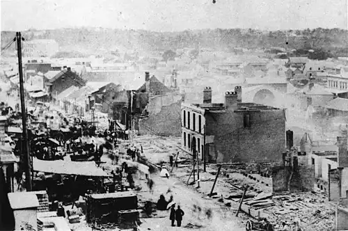 The Great fire of Brisbane was a major conflagration that swept through the central parts of Brisbane in the Colony of Queensland (now a state of Australia) on 1 December 1864. For two and a half hours the fire burned out of control in large parts of Brisbane's central business district with entire blocks being destroyed, mainly in Queen, Albert, George, and Elizabeth Streets.[1] It consumed 50 houses, 2 banks, 3 hotels, 4 draperies, and many other businesses as well as a "considerable amount of small houses".[2] Considering the extent of the fire, casualties were very few; there was no loss of life, and four people were taken to hospital with injuries.[3]