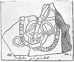 Runestone U 104 (original location) is in red sandstone measuring 1.35 m (4 ft 5 in) in height and 1.15 m (3 ft 9 in) in width.[36] It was first documented by Johannes Bureus in 1594.[36] It was donated as one of a pair (the other is U 1160[28]) to the Ashmolean Museum in Oxford in 1687 upon the request of king James II of England to king Charles XI of Sweden asking for two runestones to add to the Oxford University collection.[37] It is in the Urnes (Pr5) style. It was raised by Þorsteinn in memory of his father Sveinn and his brother Þórir, both of whom went to Greece, and lastly in memory of his mother. The stone is signed by the runemaster Öpir whose Old Norse is notable for its unorthodox use of the haglaz rune (ᚼ), as in hut for Old Norse út ("out").[38] The erratic use of the h-phoneme is a dialect trait that has survived and is still characteristic for the modern Swedish dialect of Roslagen, one of the regions where Öpir was active.[38]