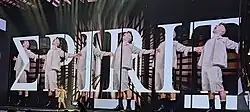 The stage presence for "What They Say" was organised by Konstantinos Rigos who served as artistic director for the entry. Rigos had previously directed the Greek entries in 2011 and 2012.[28] The performance consisted of Vernicos being alone on stage with no backing dancers or vocalists.[46] He wore a beige-coloured shorts-suit by costume designer George Segredakis,[34][47] and was surrounded by a video wall showing rainfall, a large-scale video of himself, as well as lyrics of the song in English and the Greek alphabet.[47][48] Rigos described the inspiration for the stage presence as "Greek summer".[46]