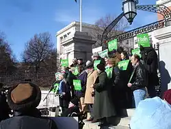 For some years, the party was involved in co-organizing an annual March to Abolish Poverty.[6] Like many small parties that view the Democratic and Republican parties as creating difficult ballot access laws, the party has also pushed for electoral reforms, particularly ranked choice voting and publicly financed campaigns. The party also champions universal health care and strongly supported marriage equality, long before the Massachusetts Supreme Judicial Court's decision to allow same-sex marriages within Massachusetts. The Green-Rainbow party supports having an economic bill of rights including a right to food, water, health care, housing and education. It supports a far bolder and faster transition from fossil fuels to safe, clean renewable energy than the Democratic and Republican parties. It sees climate change as an existential emergency. It supports racial justice and justice for documented and undocumented immigrants including an end to the incarceration epidemic and community control of the police. In 2019, the Green-Rainbow Party State Committee voted to support the elimination of the United States military.[7][8]