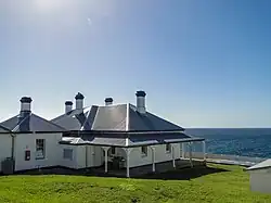 The complex of buildings that make up the lightstation include a number of simple painted rendered brick buildings typical of rural lightstations around Australia. The residences of the Head Keeper and the two Assistant Keepers (and families) were built in the Victorian Regency style and retain much of their original features and layout. The Head Keepers Quarters comprises four bedrooms with a parlour and living room, surrounded by a verandah on three sides. An adjoining annex houses storage rooms and an updated bathroom and kitchen. The Assistant Keepers Quarters are an identical duplex comprising two bedrooms, a living room, dining room, kitchen and bathroom (similarly updated). The duplexes are surrounded by verandahs on three sides also. The original arrangement of the quarters remains identifiable but a door has been fitted between the two living rooms to enable its use as a single residence.[4]