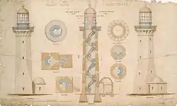 The original apparatus, still mounted in the lantern, is a Chance Bros. 1st order revolving Fresnel lens dioptric. Its light characteristic was one flash every 50 seconds[7] and it was visible to 19 nautical miles (35 km; 22 mi).[8] The light source was a four-wick kerosene-burning lamp with an intensity of 100,000 cd.