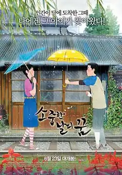 Green Days: Dinosaur and I (Korean: 소중한 날의 꿈; RR: Sojoonghan Nalui Ggoom; lit. "Dream of a Precious Day") is a 2011 South Korean animated film. Without the high-tech computer graphics and three-dimensional techniques that dominate the animation industry, the film was hand-drawn in pencil, with 14 animators using 100,000-plus sheets over a period of 11 years.[1] It premiered at the 15th Busan International Film Festival in 2010 and competed for the top prize at the 2011 Annecy International Animated Film Festival.[2][3]
