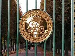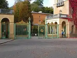 The Green Gate (German: Grünes Gitter) in Potsdam is the main gateway into Sanssouci Park and is situated at the end of the avenue to Sanssouci Palace. This begins as one of three roads that radiate from the Luisenplatz square. The gate was designed by Ludwig Ferdinand Hesse and was put up in 1854 as part of the construction of the Church of Peace. Its name comes from the colour in which the gate was painted. Additional ornamentation is provided by individual bars and points being picked up in gold leaf. The iron gate bears the initials of Frederick William IV.