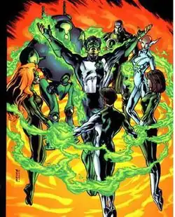 As the backup arrives team-by-team, the friends fill each other in on what each team had discovered. Piecing together the clues, Kyle concludes that Pel Tavin must be the traitor that the Spectre warned about. Before the Emerald Knight and Power Girl return, however, Oblivion attacks the heroes, killing Forest. As the Atom and Hunter are about to face the same fate, the missing duo swoops in to save them. Realizing that Pel Tavin was not Oblivion after all, Kyle charges towards the supervillain, only to be transported into his own subconscious. There, he learns that Oblivion was created using the power of the ring and the negative emotions Kyle bottled up after Alex's death and that the new Green Lanterns are equally imagined, each representing a positive aspect of Kyle's subconscious; Alex is an embodiment of Kyle's capability for love, while Tavin represents his courage, Ali represents hope, G.L.7177.6 represents logic, and Hunter and Forest represent imagination.[3][4][2]