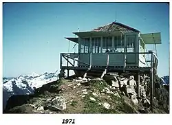 The original structure was built in 1933 and was originally used as a fire lookout tower. Since its initial construction, the lookout has often been subjected to severe winter weather which has, on a number of occasions, caused structural damage requiring extensive repairs. In 1950, the roof was replaced and walls, windows, and doors were repaired after heavy snowfall damaged the building the previous winter.[5]