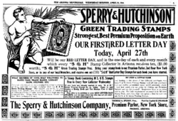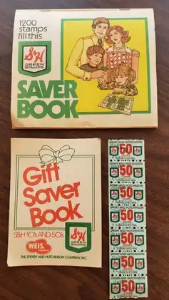 S&H Green Stamps was a line of trading stamps popular in the United States from 1896 until the late 1980s. They were distributed as part of a rewards program operated by the Sperry & Hutchinson company (S&H), founded in 1896 by Thomas Sperry and Shelley Byron Hutchinson. During the 1960s, the company issued more stamps than the U.S. Postal Service and distributed 35 million catalogs a year.[1] Customers received stamps at the checkout counters of supermarkets, department stores, and gasoline stations among other retailers, which could then be redeemed for products from the catalog.[2] Top Value Stamps ceased operations in the early 1980s, after which S&H accepted savings books for those who had unredeemed Top Value books, before S&H itself ceased business.[3]