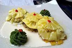 The Green Tangerine is a restaurant in Hàng Bè Street, Hoàn Kiếm, Hanoi, Vietnam. Set in a colonial building dated to 1928, in the heart of the Old Quarter, it serves French cuisine, with "Vietnamese undertones".[1][2] It retains the ambiance of 1950s French Indochina, and has its own cobblestone courtyard.[3] CNN states that it "meets all expectations of colonial Asian seductiveness".[4] Frommer's notes its "creamy Cointreau-flavored frozen yoghurt served in a green tangerine shell".[5] The former chef of the restaurant for thirteen years was Yvin Stephane.[6]